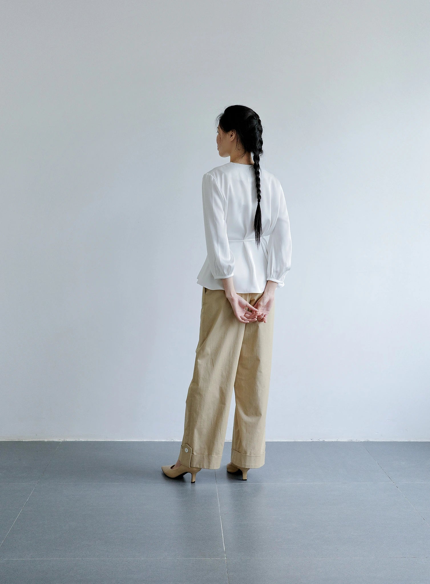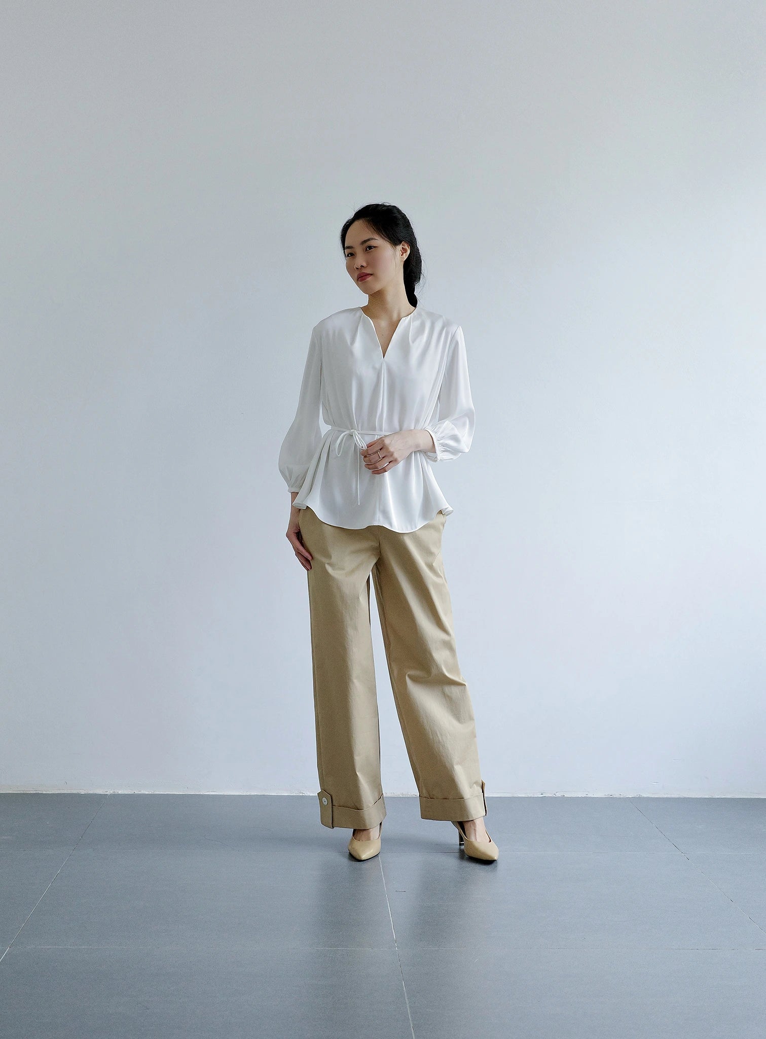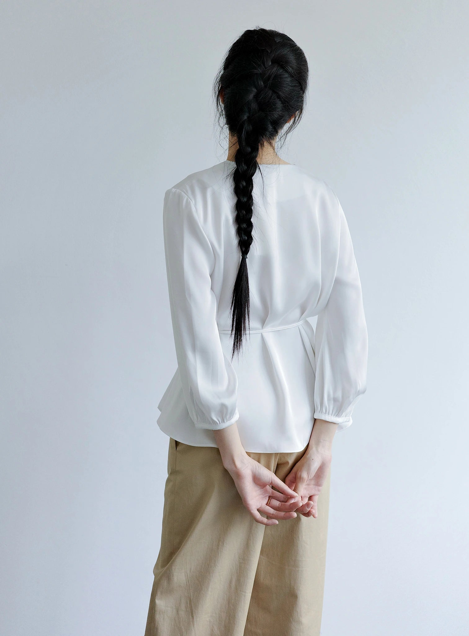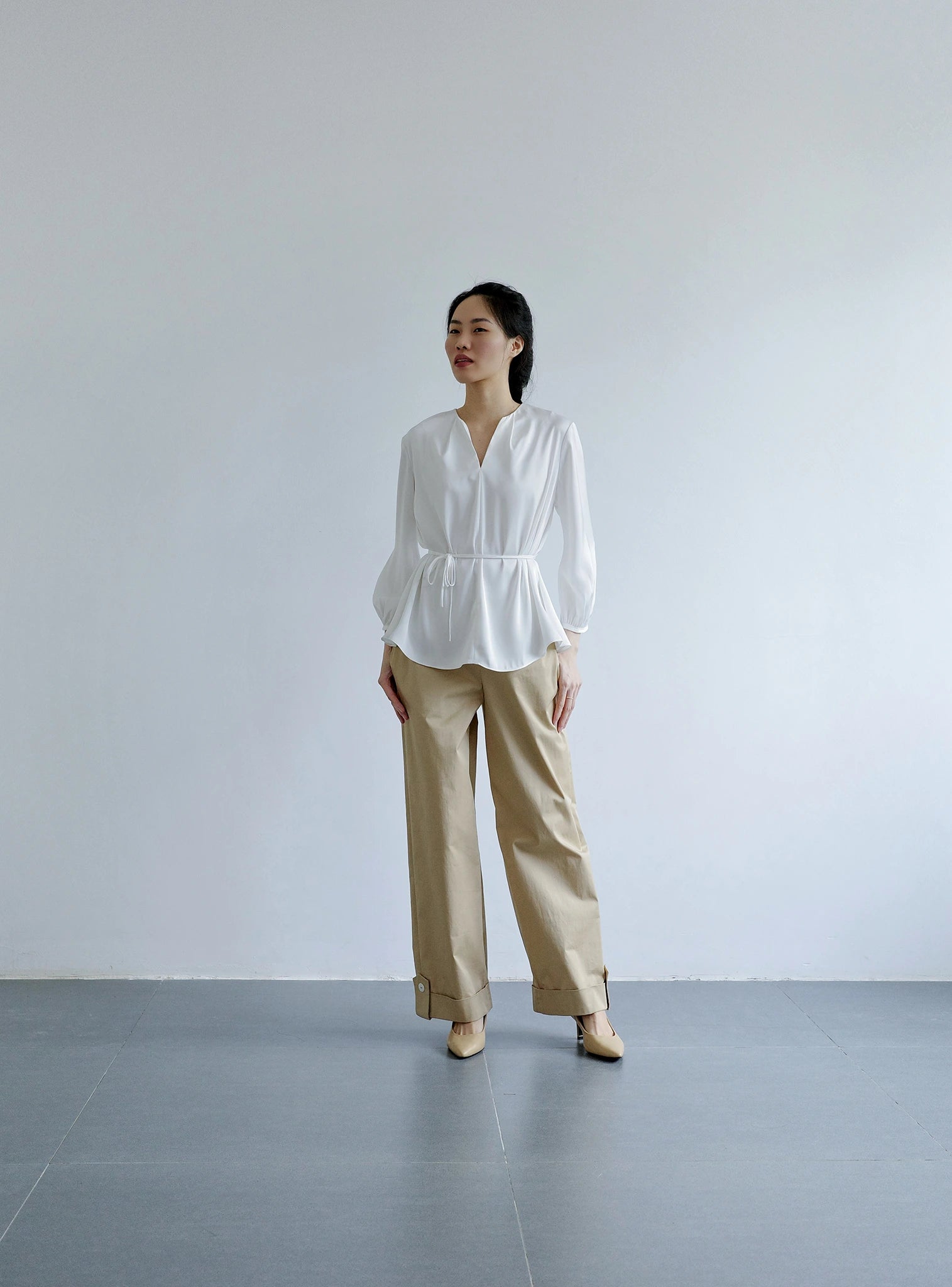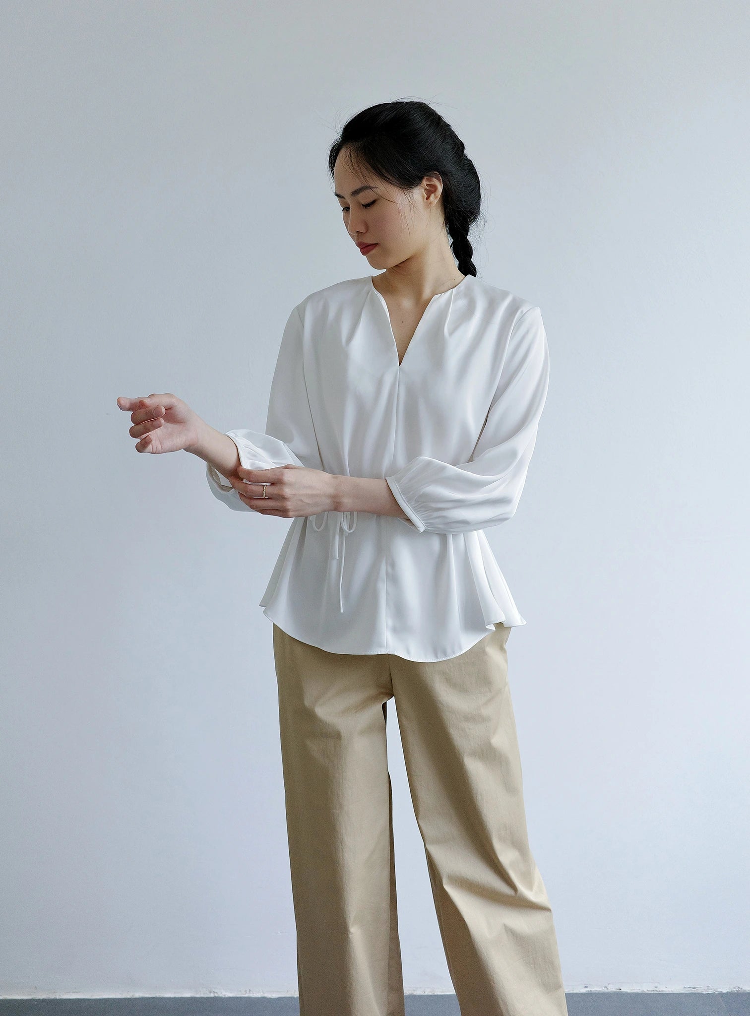 Áo kiểu nữ cổ tròn xẻ V hiện đại, trẻ trung kết hợp cùng tay áo lỡ kín đáo vừa khéo tôn lên phong cách thời trang thanh lịch của bạn. Với chất liệu satin mềm mại cùng màu trắng nhẹ nhàng rất dễ dàng để phối cùng nhiều kiểu quần vá váy khác nhau để tạo nên những set đồ của riêng bạn. Phụ kiện kèm theo là dây thắt eo dài.