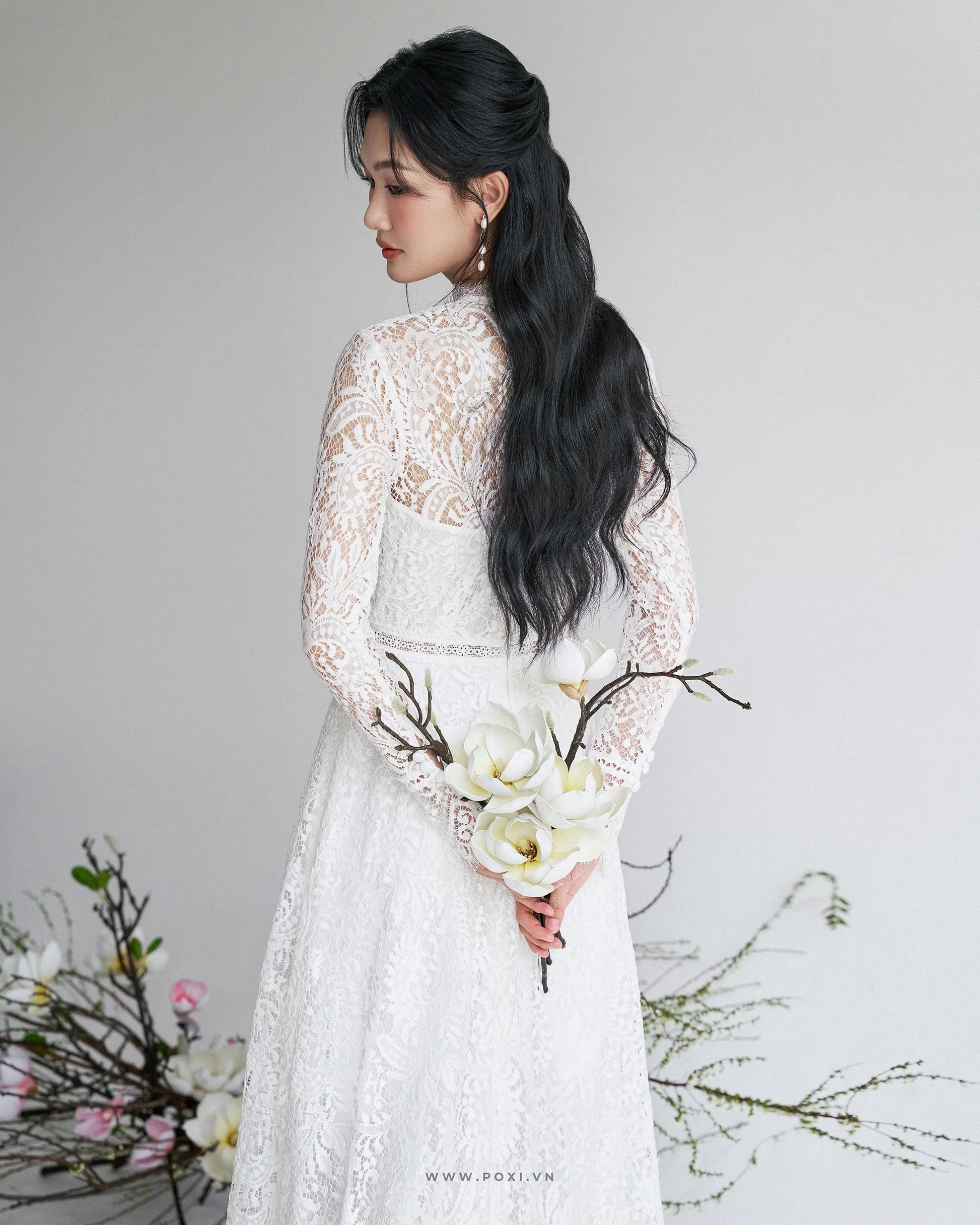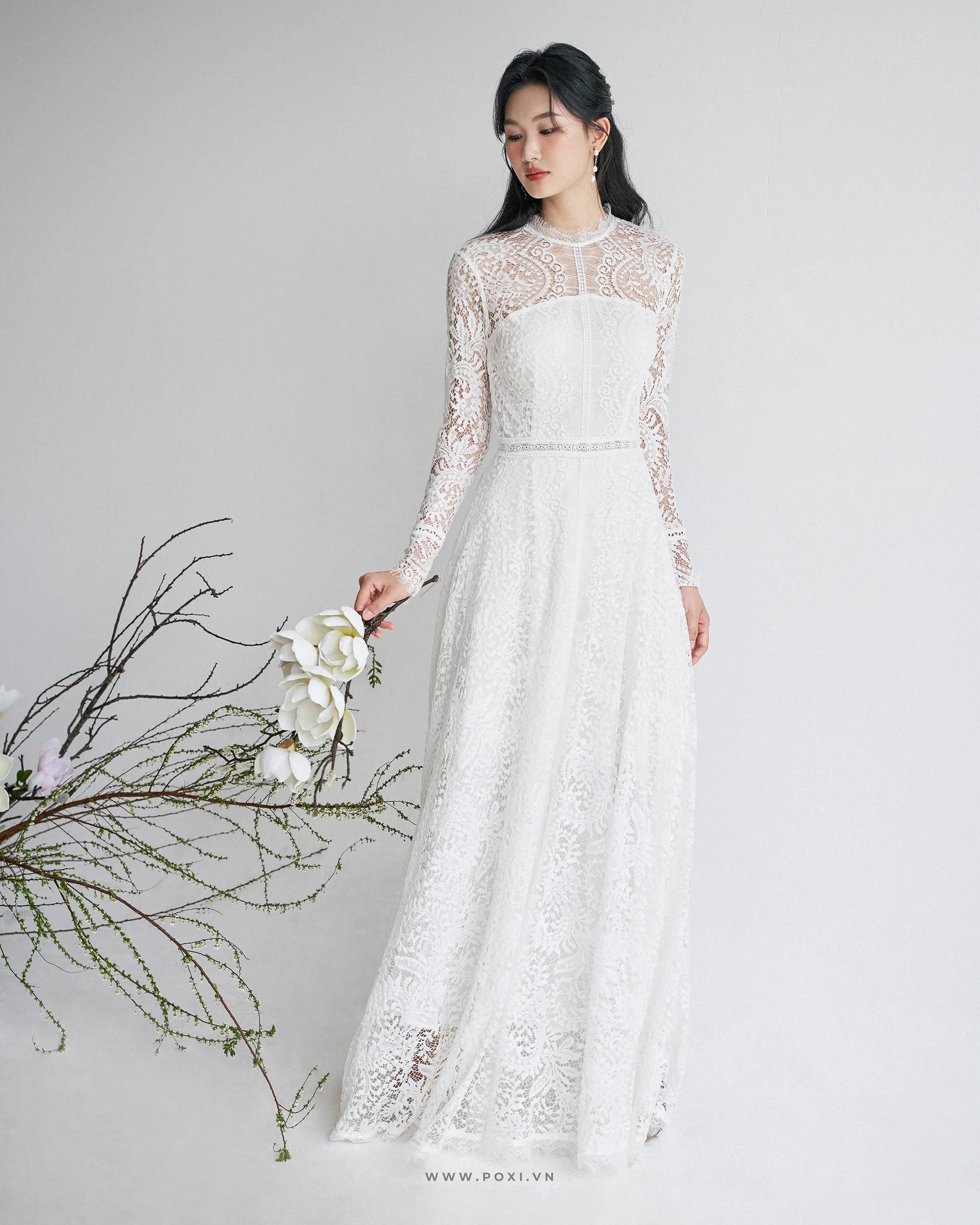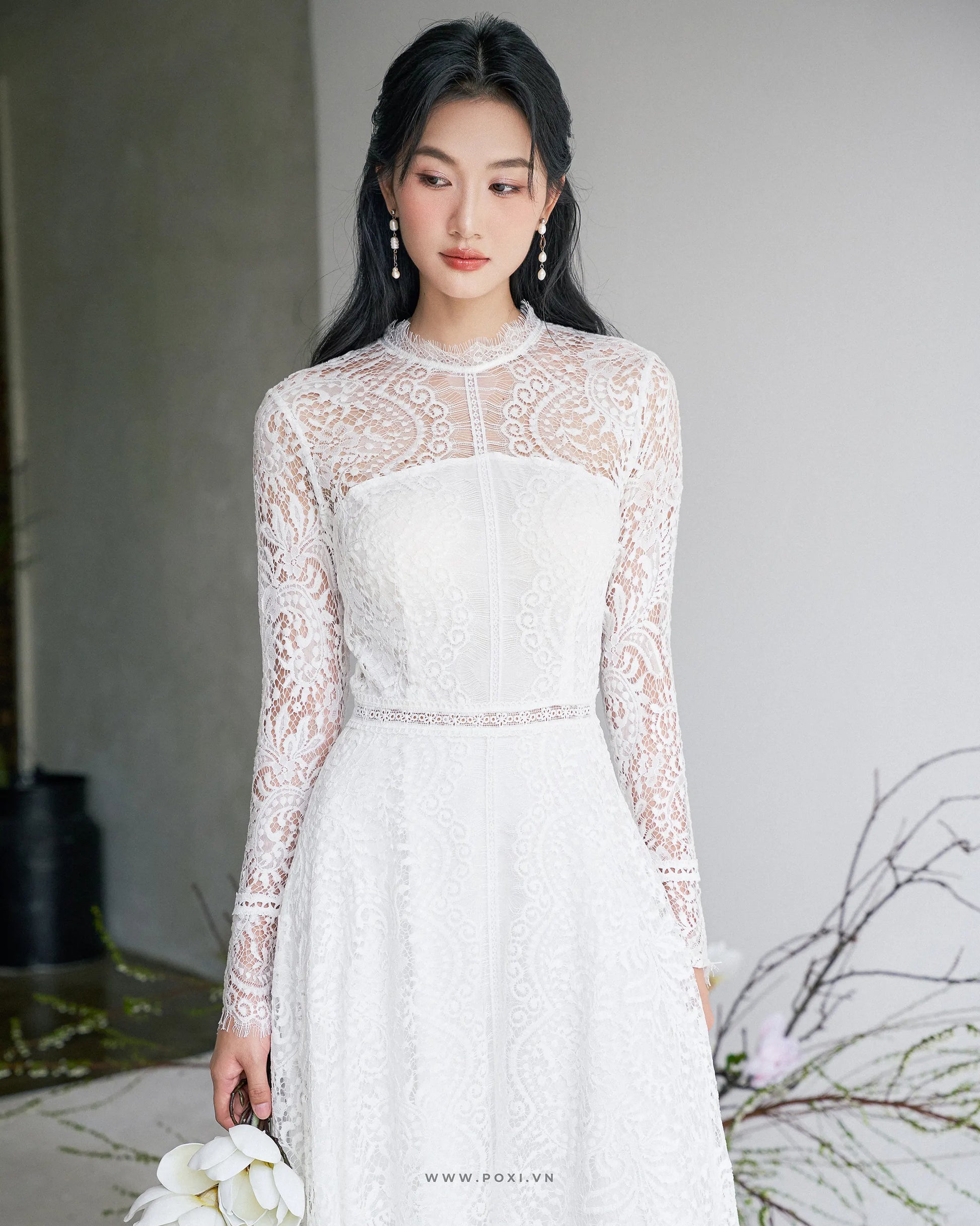 Một chiếc đầm ren nhẹ nhàng và thơ mộng lại vô cũng thoải mái, cùng sự cắt may tỉ mỉ, sắp xếp họa tiết của các chi tiết váy và thân áo đối xứng liền mạch với nhau tạo hiệu ứng thị giác đẹp mắt, giúp cho nàng có một vẻ ngoài hoàn mỹ nhất trong ngày quan trọng.