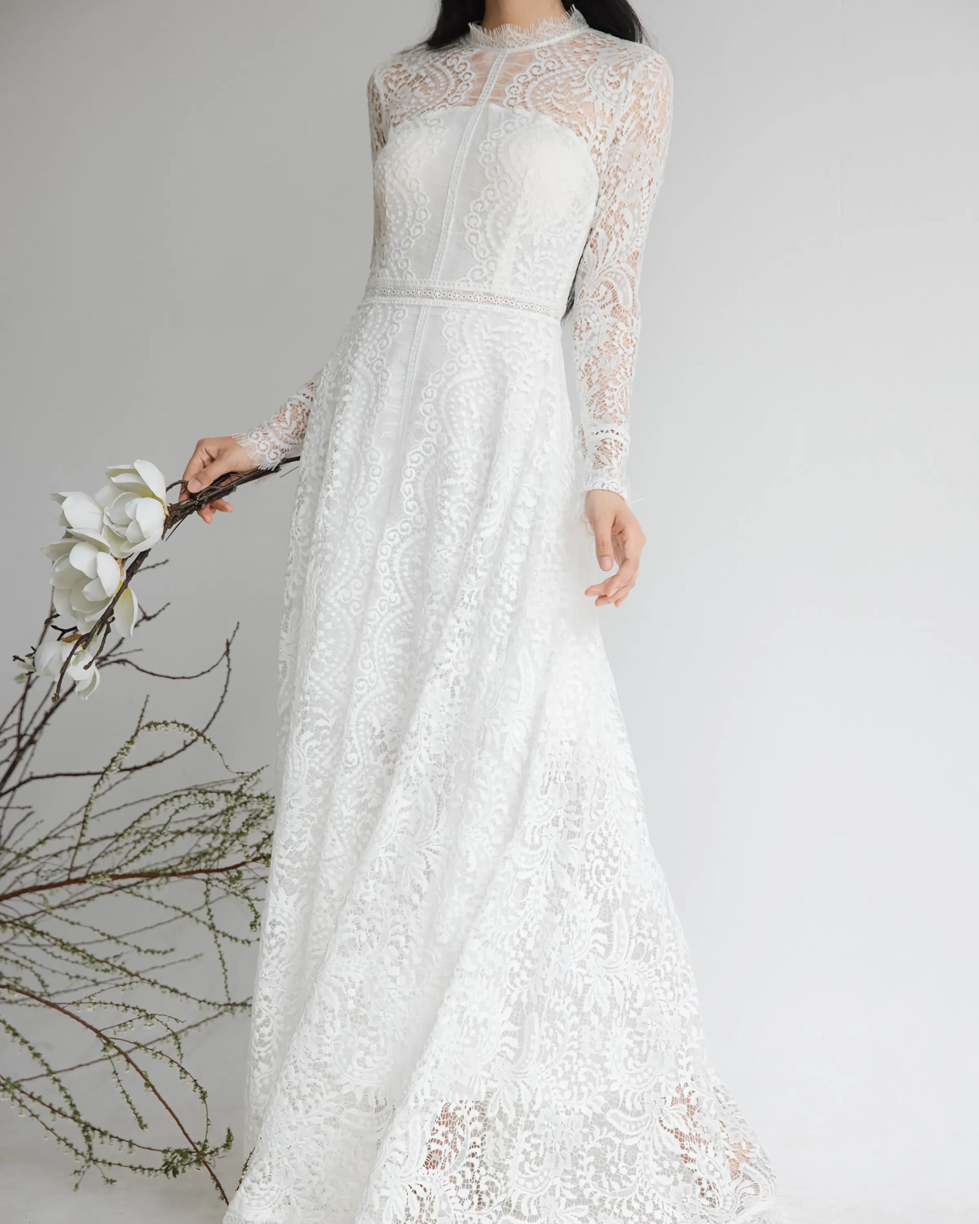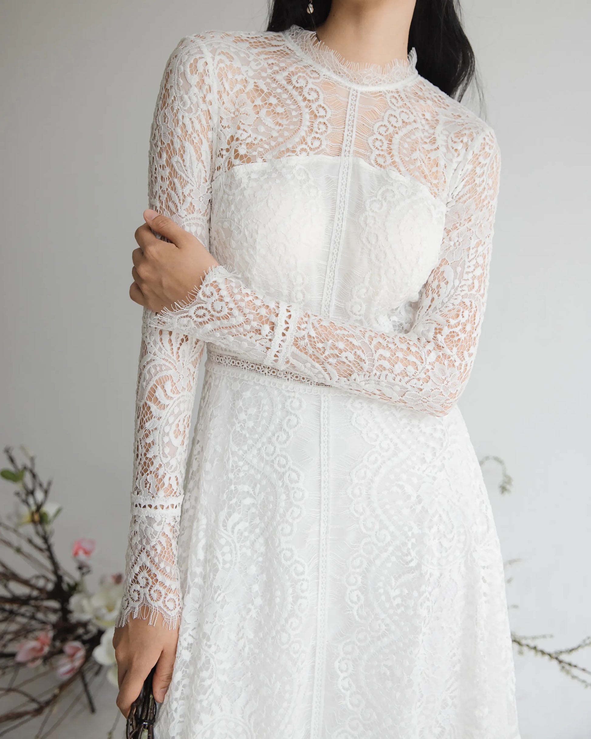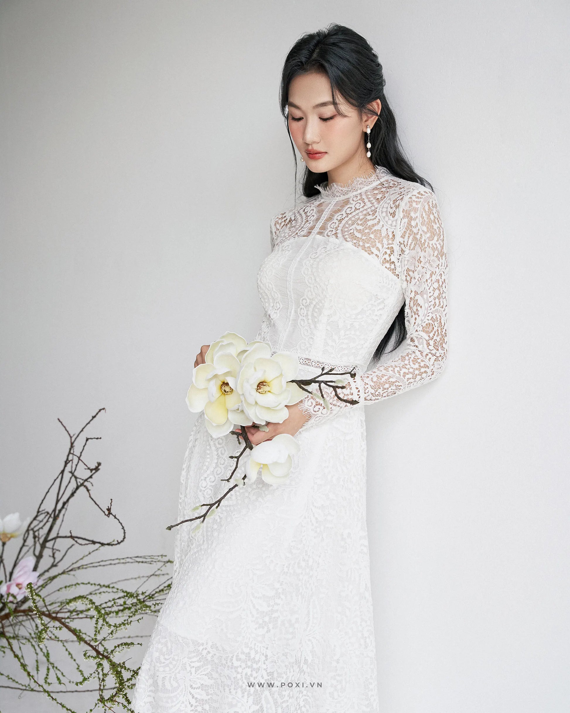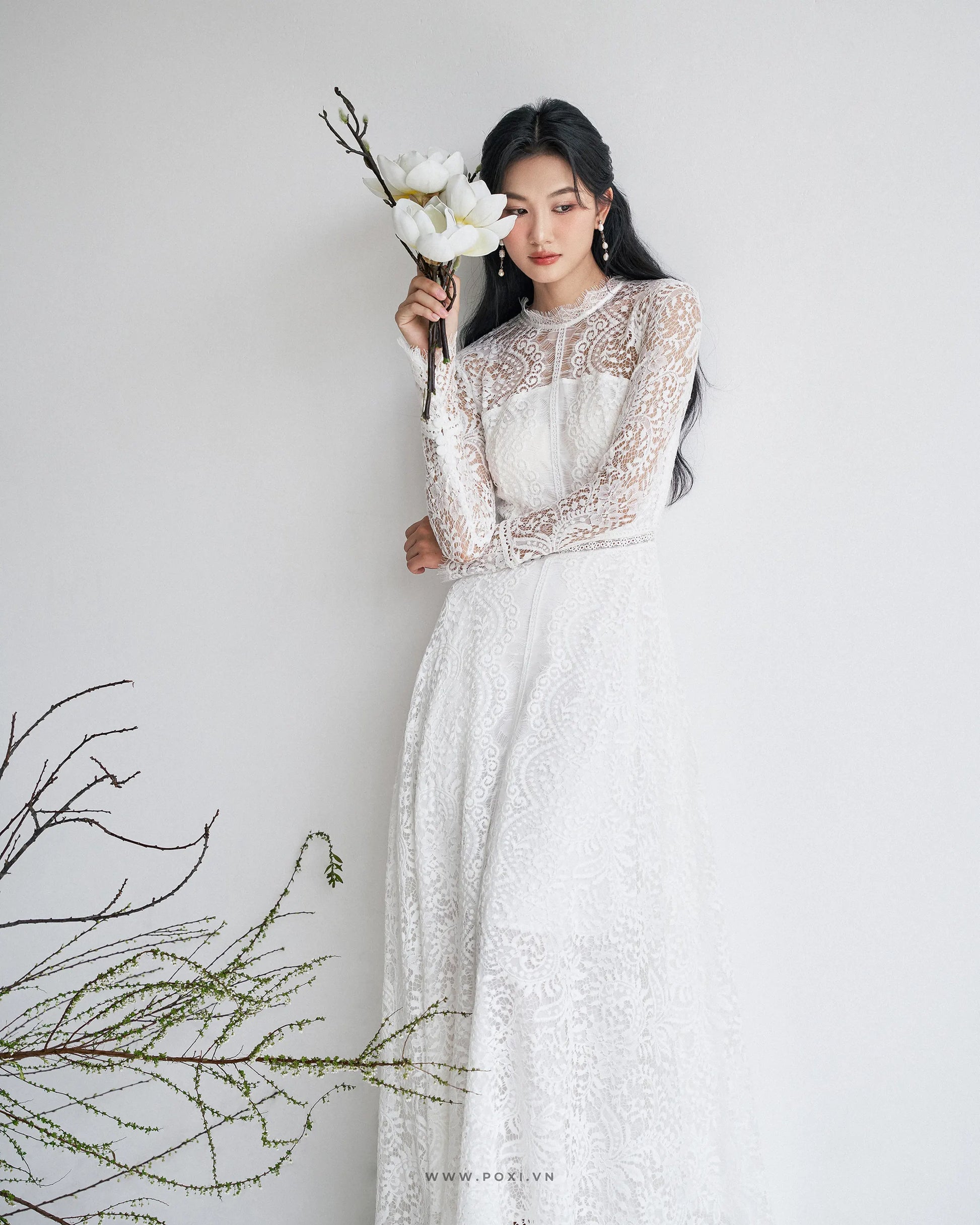 Một chiếc đầm ren nhẹ nhàng và thơ mộng lại vô cũng thoải mái, cùng sự cắt may tỉ mỉ, sắp xếp họa tiết của các chi tiết váy và thân áo đối xứng liền mạch với nhau tạo hiệu ứng thị giác đẹp mắt, giúp cho nàng có một vẻ ngoài hoàn mỹ nhất trong ngày quan trọng.
