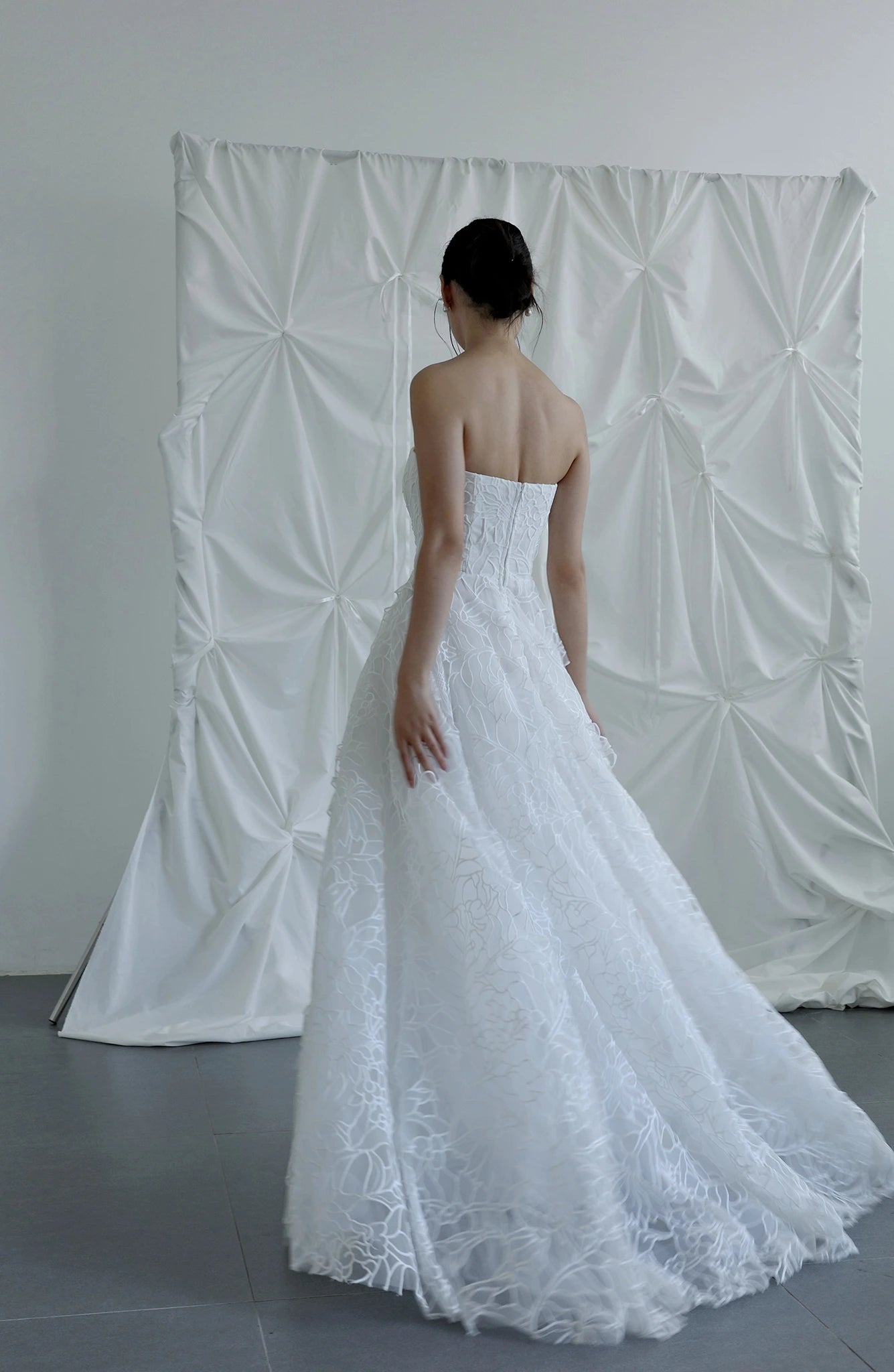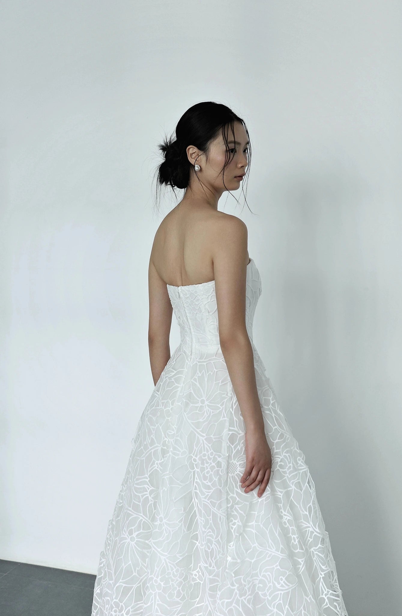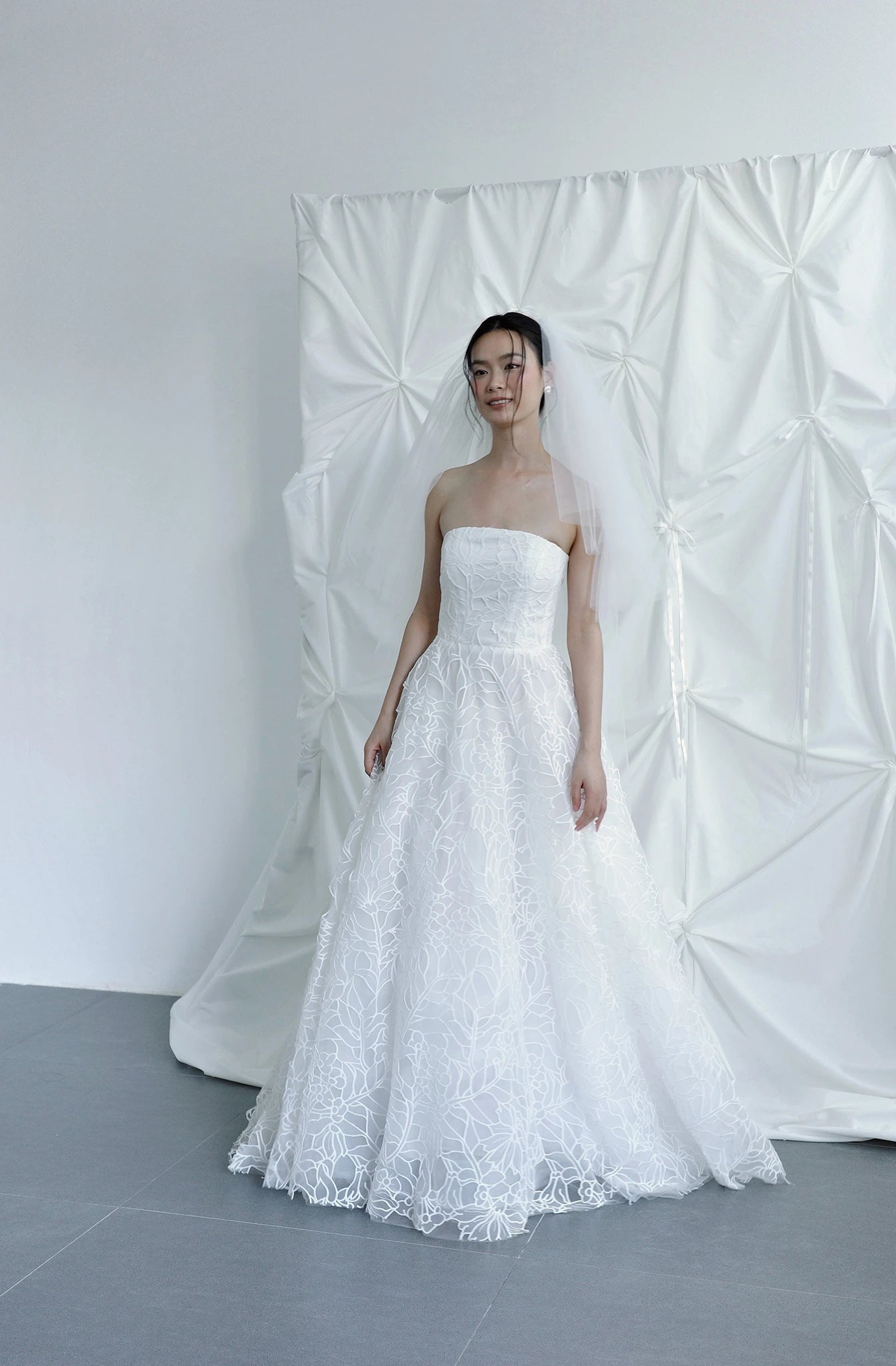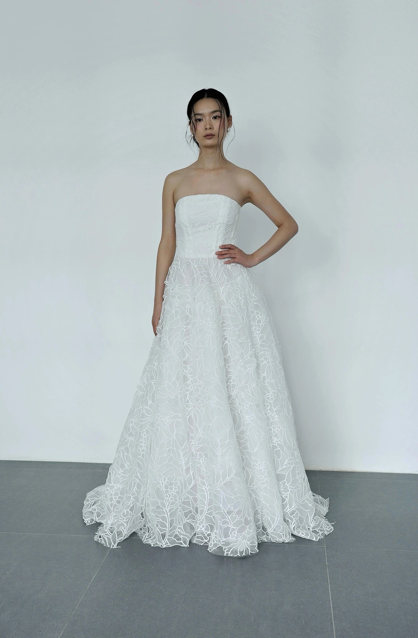 Hiên đại và quyến rũ hơn với thiết kế váy cúp ngực giúp nàng dâu để lại ấn tượng sâu sắc và thu hút ánh nhìn của mọi người trong suốt buổi tiệc. Họa tiết ren nổi bật cùng kiểu váy xòe bay bổng khéo léo tô điểm vẻ ngoài kiêu sa và nhẹ nhàng của nàng dâu mới.