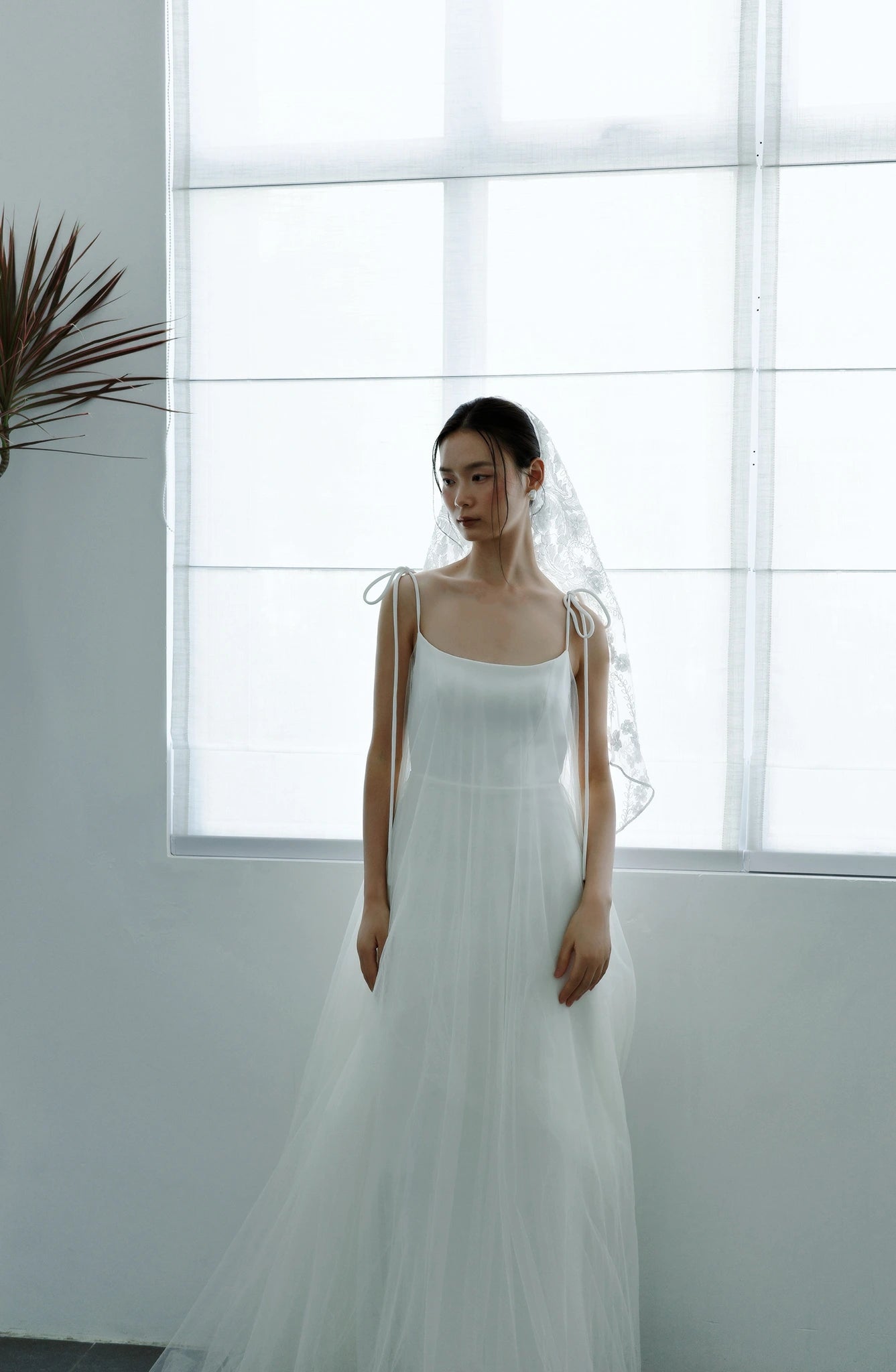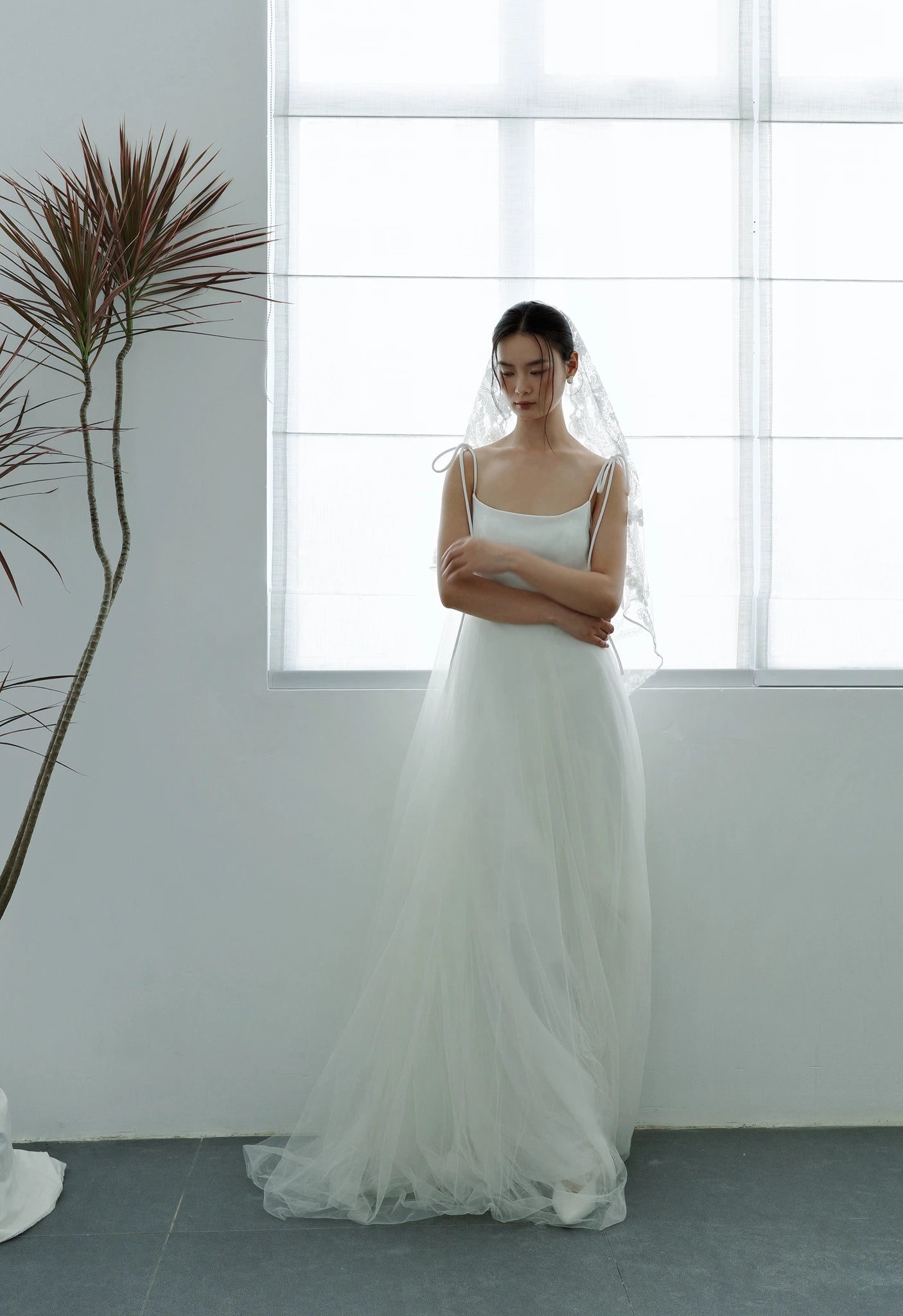 Thiết kế với kiểu dáng váy hai dây thắt nơ vai và form váy xòe phối lưới bay bổng như tô điểm thêm vẻ ngoài ngọt ngào và đầy nữ tính của nàng dâu tương lai.