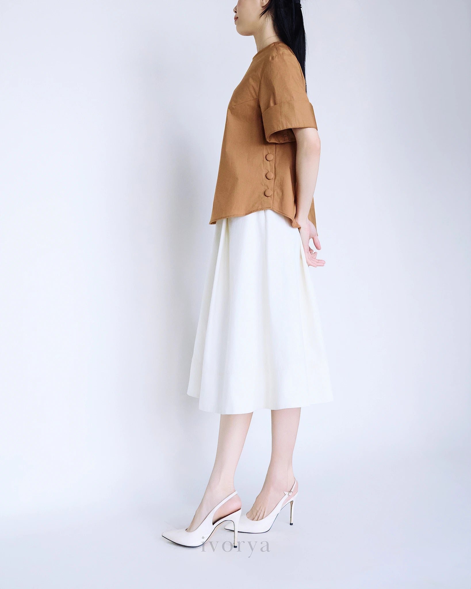 Áo cổ tròn màu nâu, tay áo ngắn lai to bản - SH9781