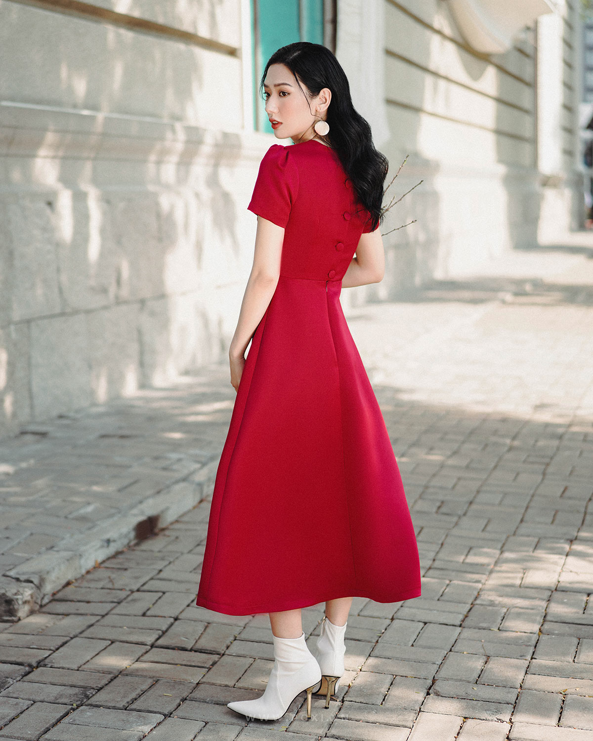 Đầm cổ tròn tay ngắn nhún nhẹ đầu vai, cài nút giữa lưng sau - D1500D