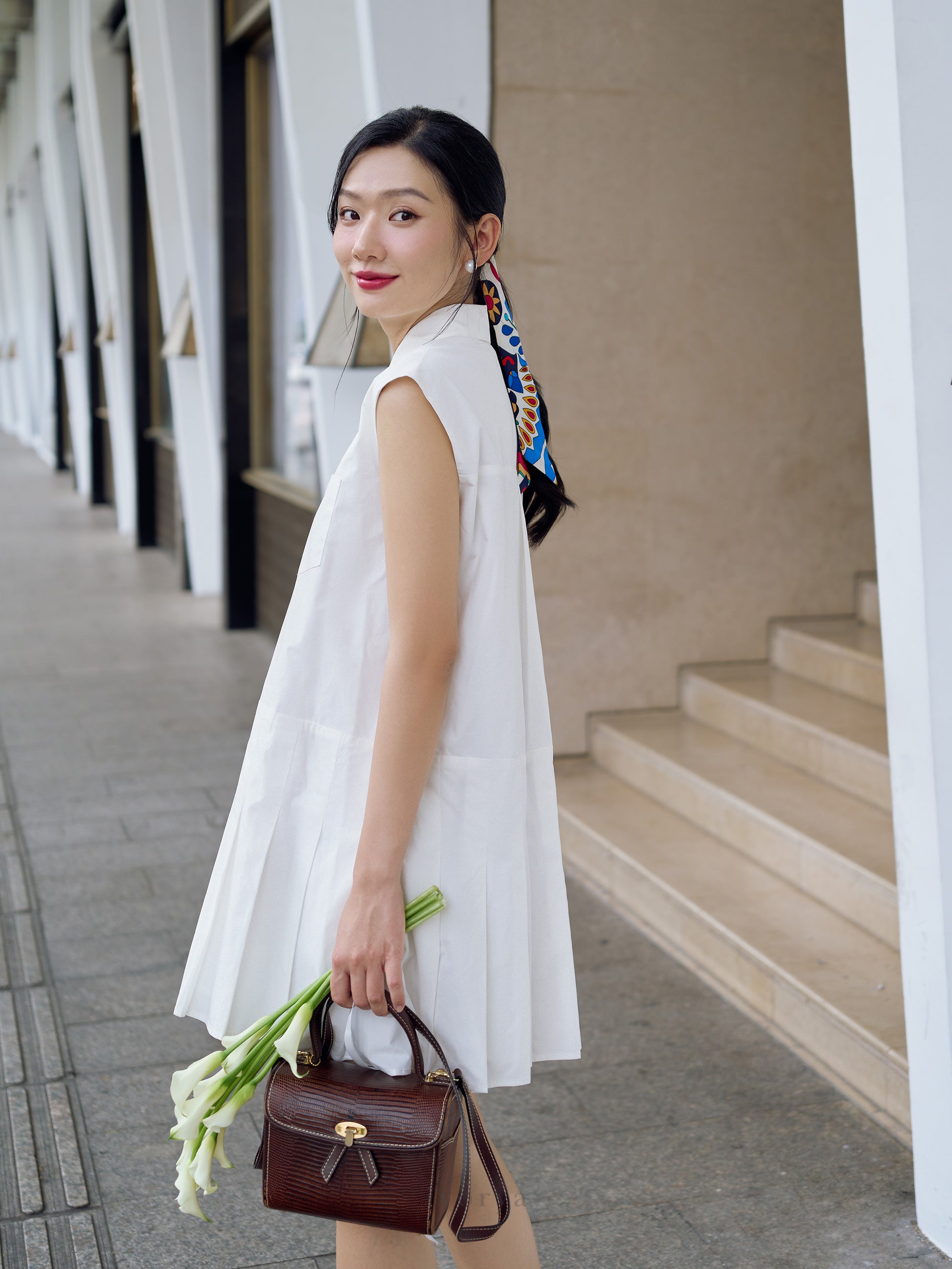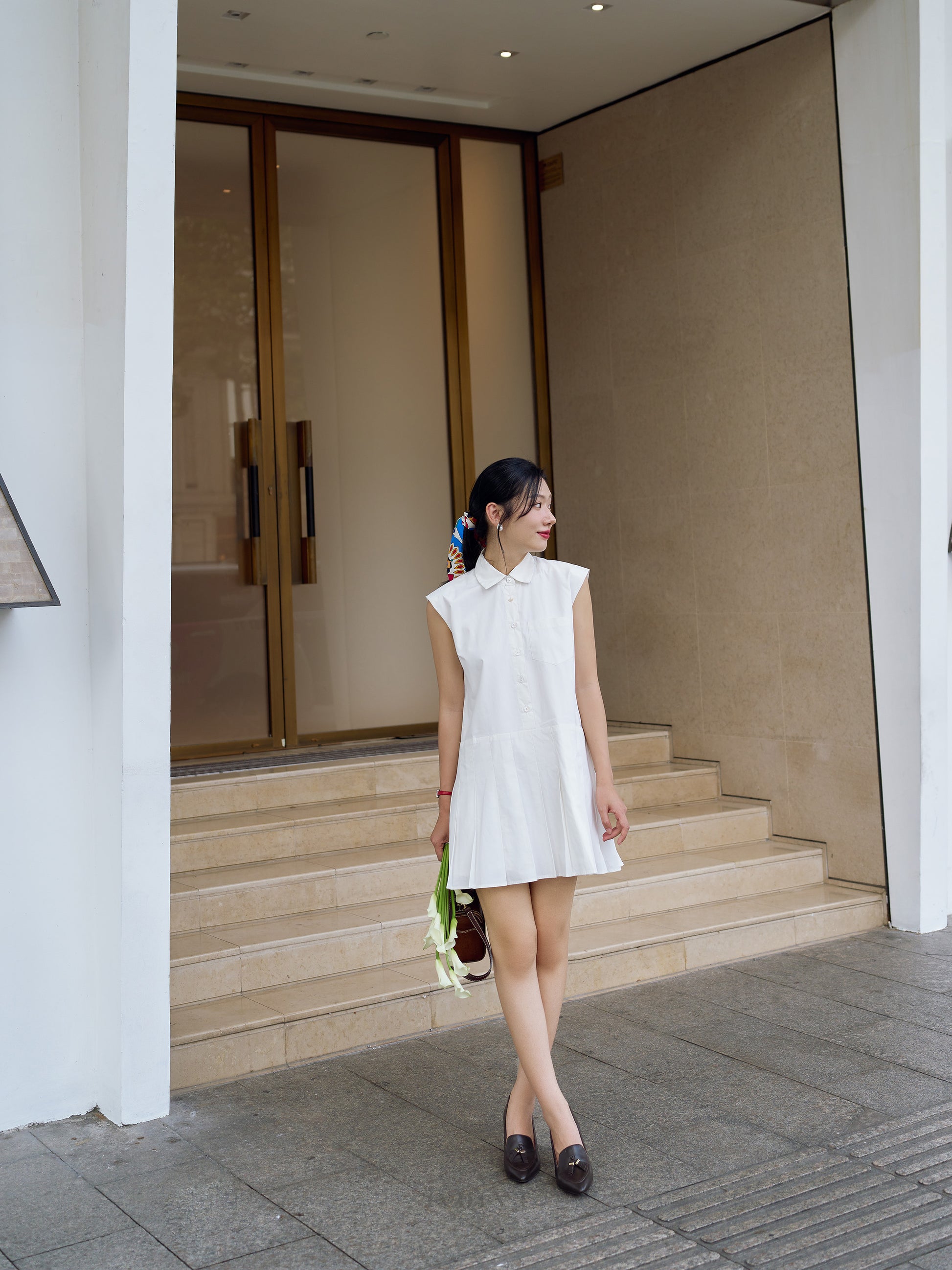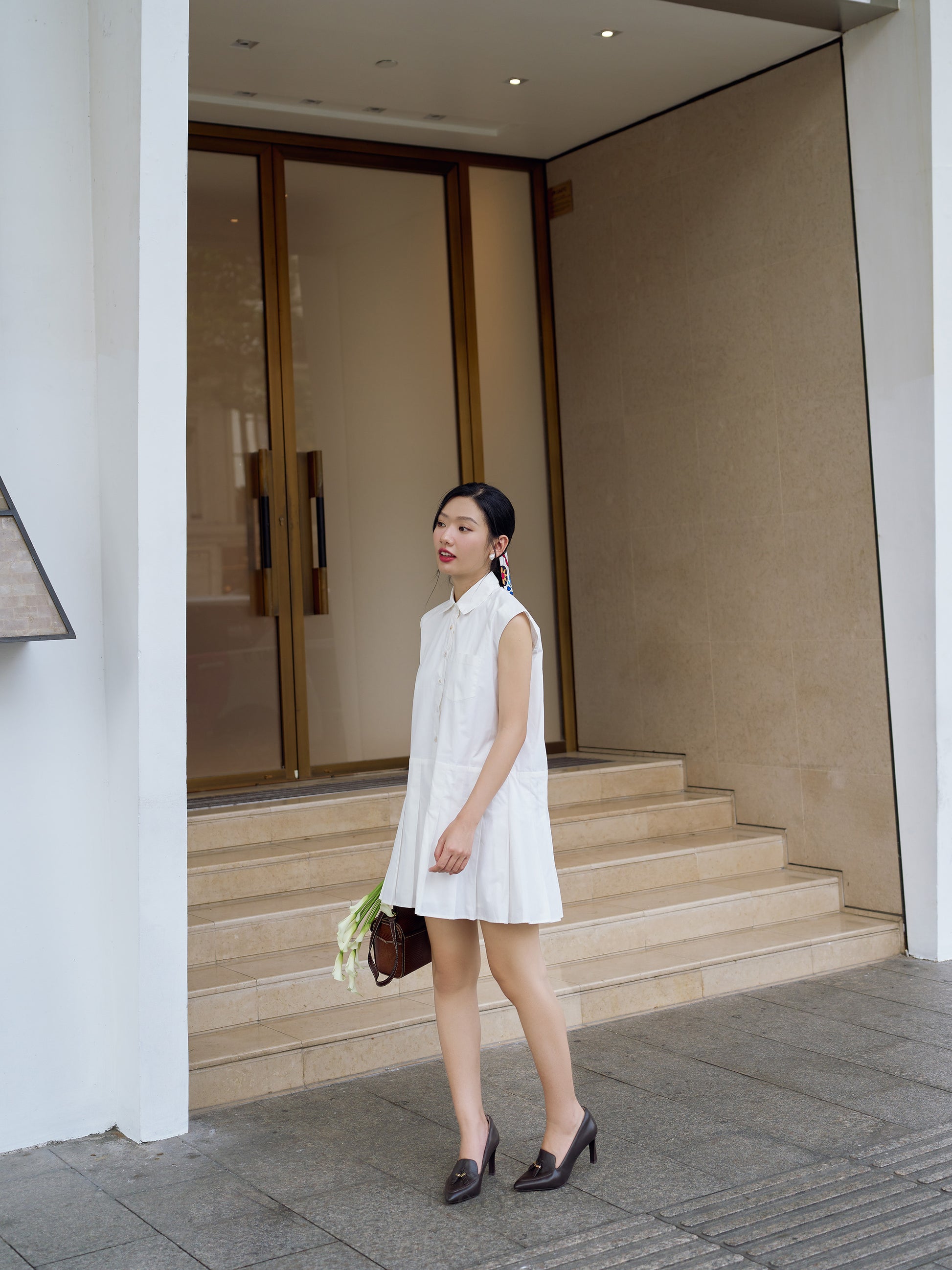 Đầm sơ mi nữ xếp ly ngắn trên gối màu trắng, không tay.