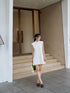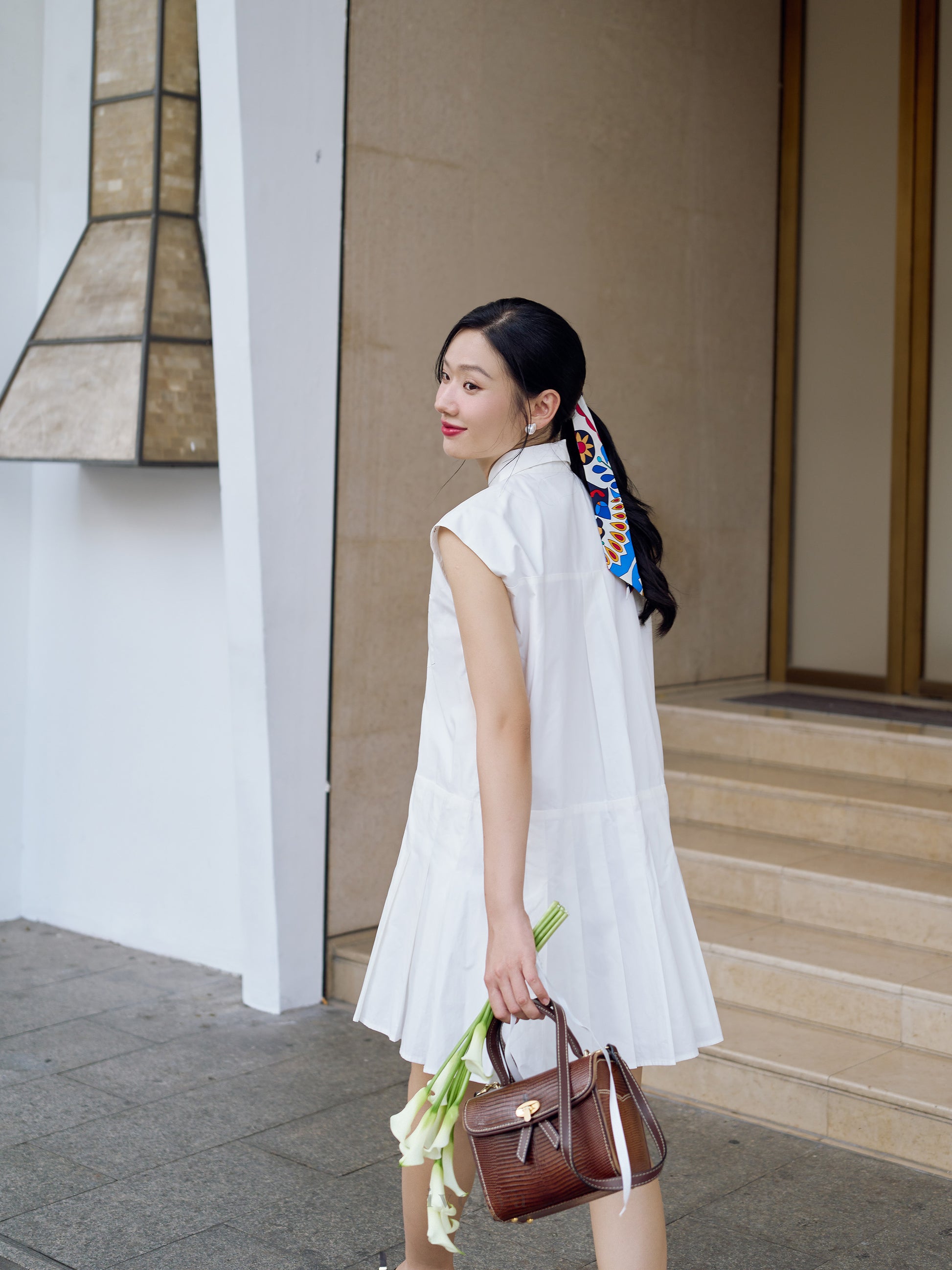 Chiếc đầm ngắn cơ bản với điểm nhấn là chi tiết xếp ly ở váy, chiều dài ngắn trên gối mang đến dáng vẻ năng động, trẻ trung cho các cô gái.