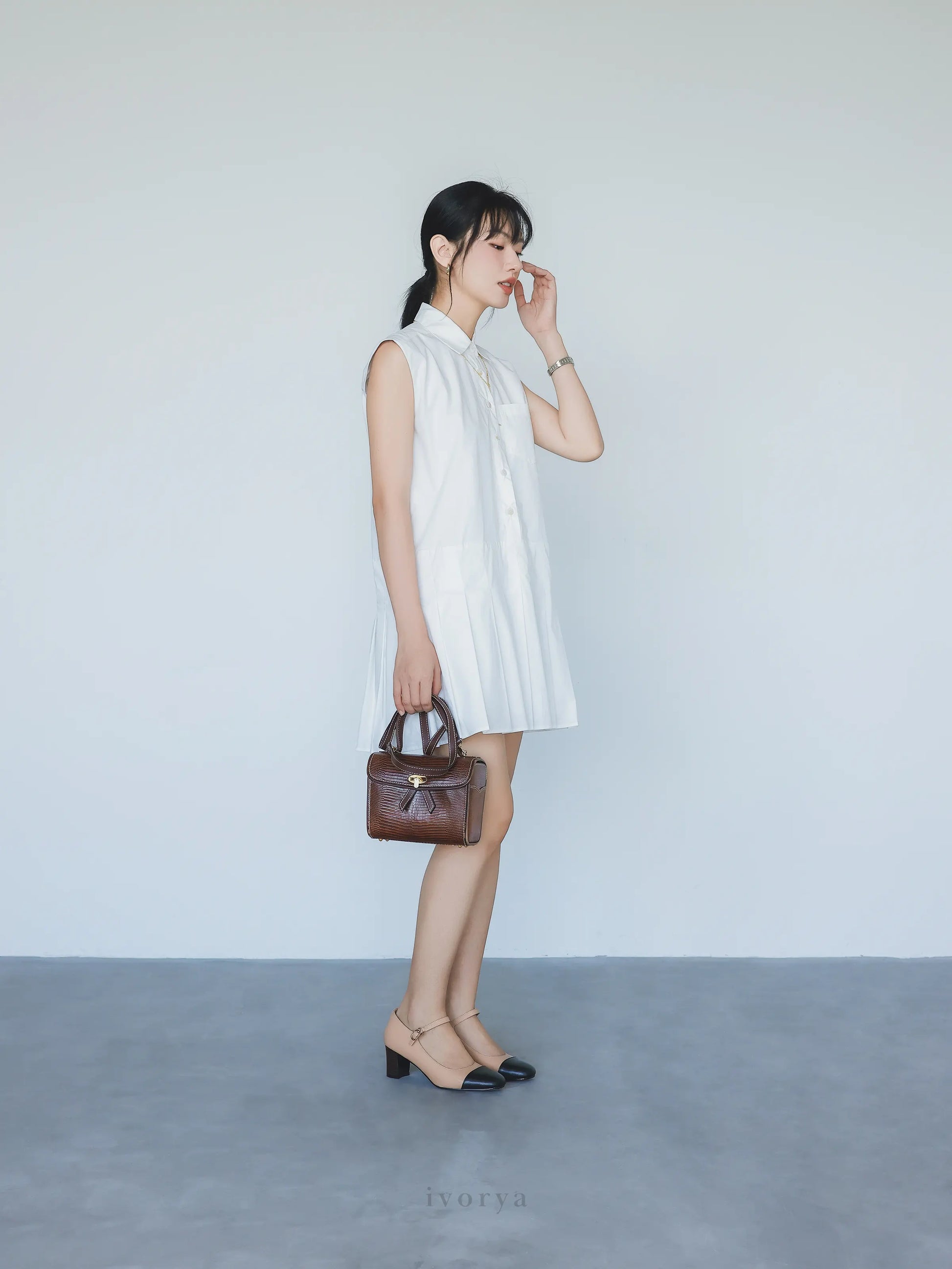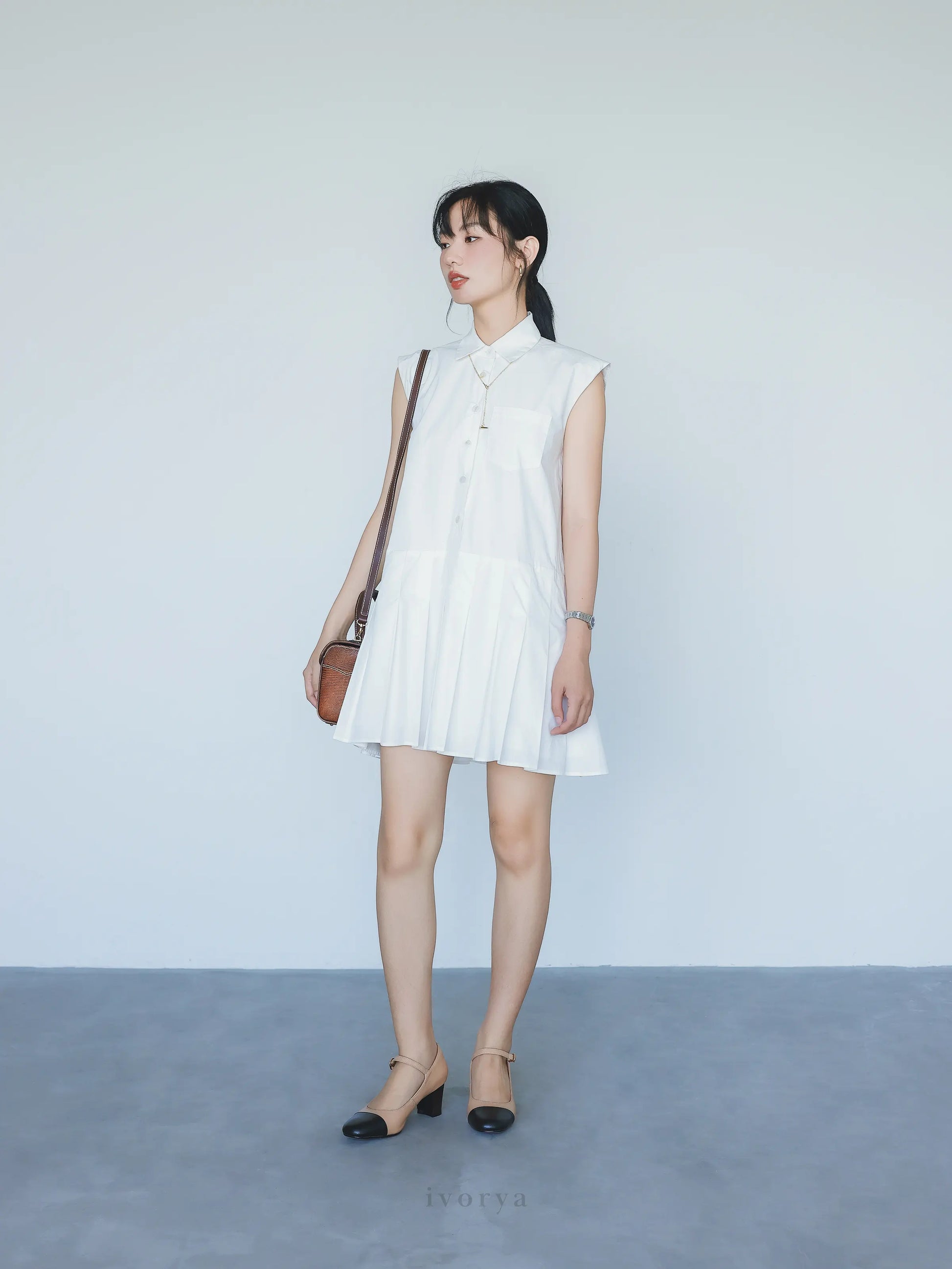 Đầm sơ mi nữ xếp ly ngắn trên gối màu trắng, không tay.
