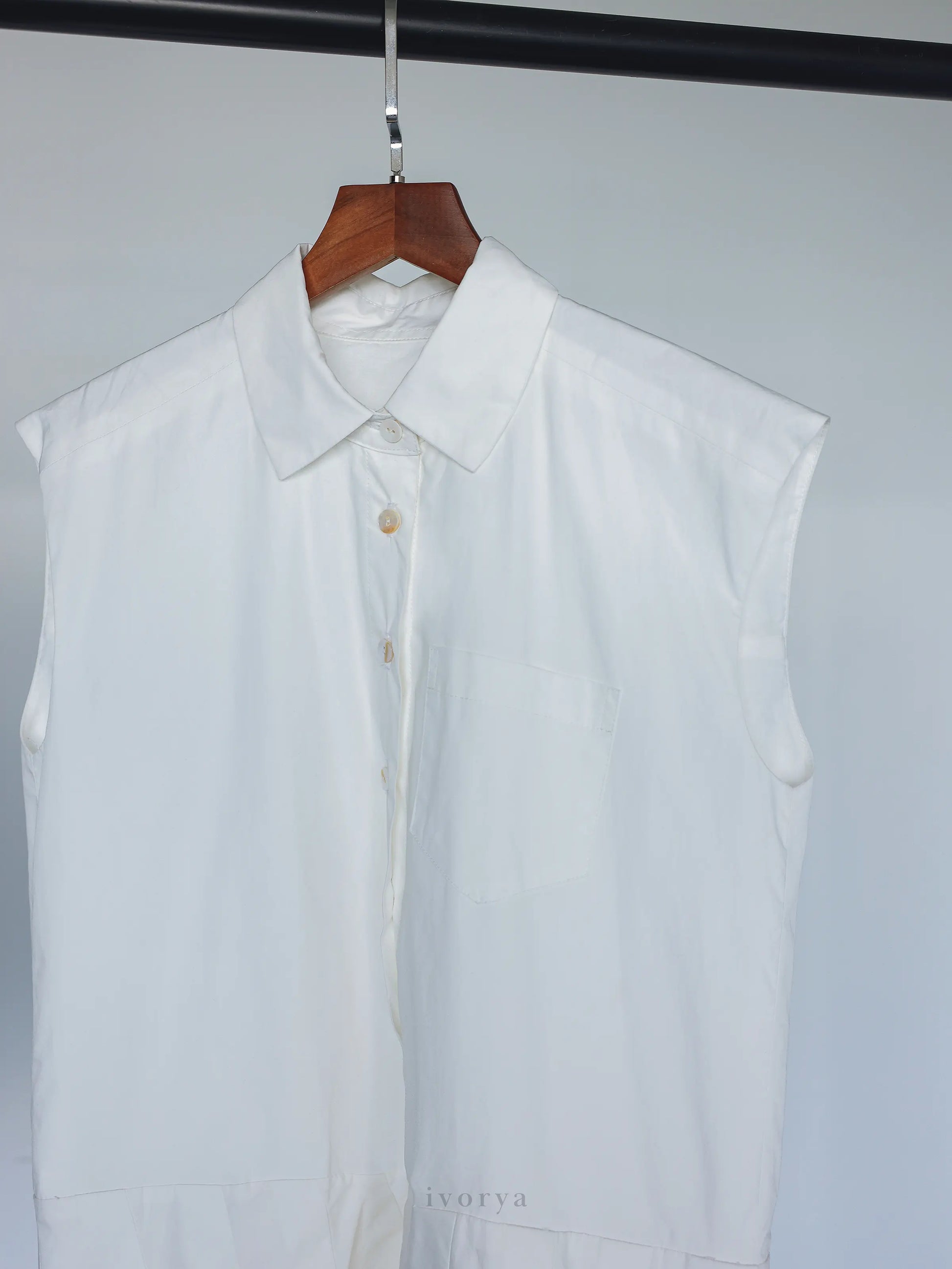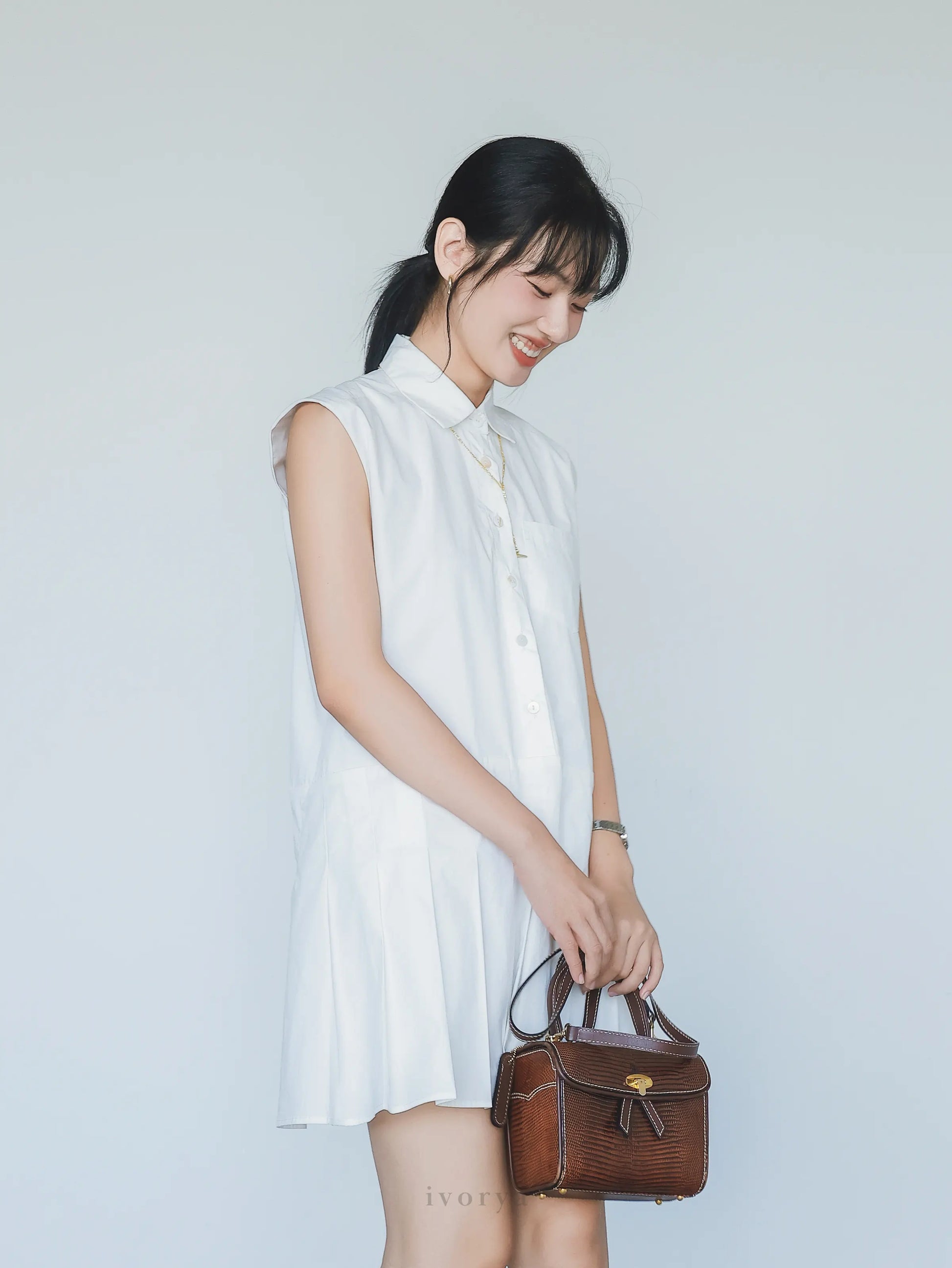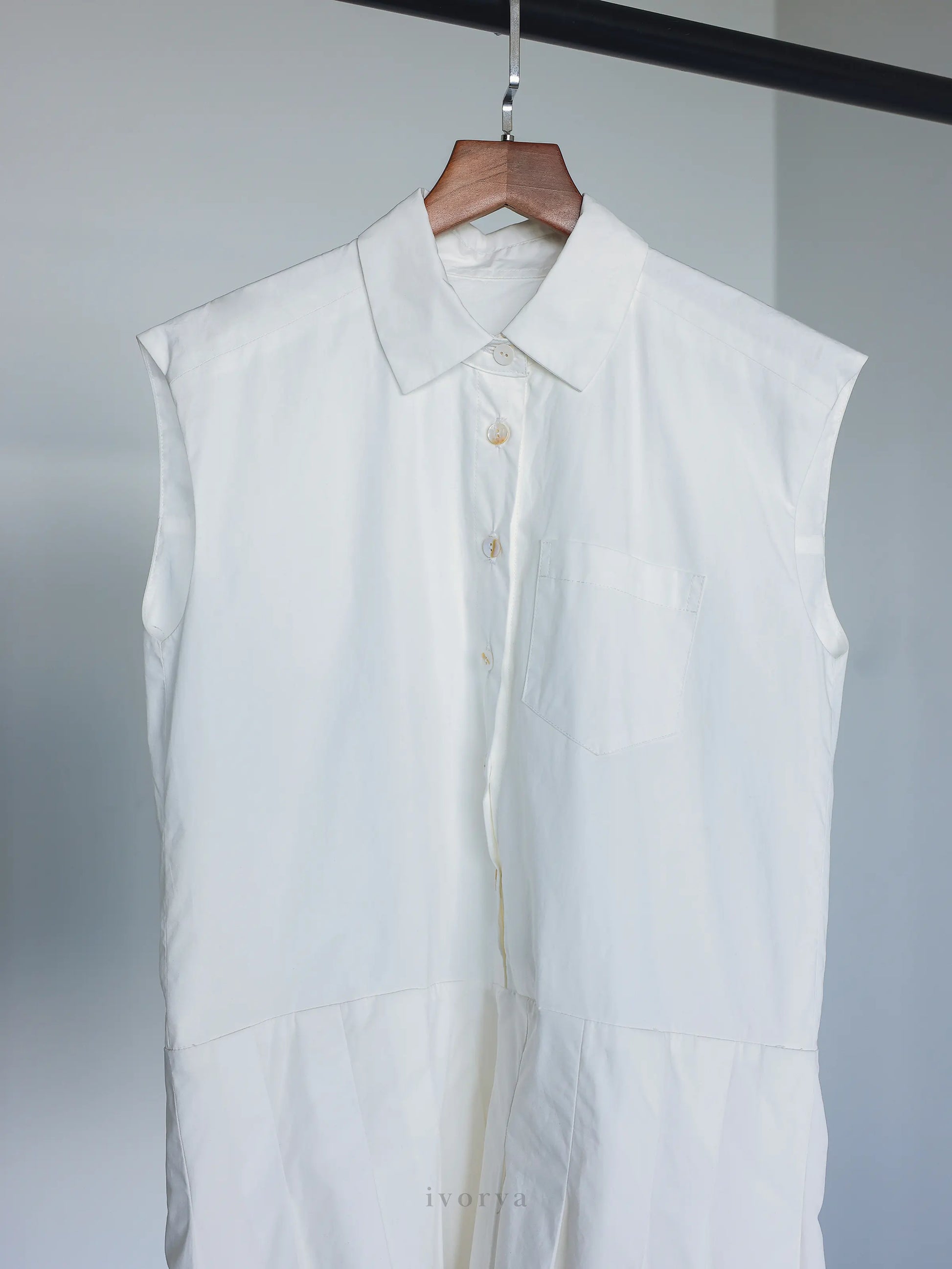 Đầm sơ mi nữ xếp ly ngắn trên gối màu trắng, không tay - YD9957